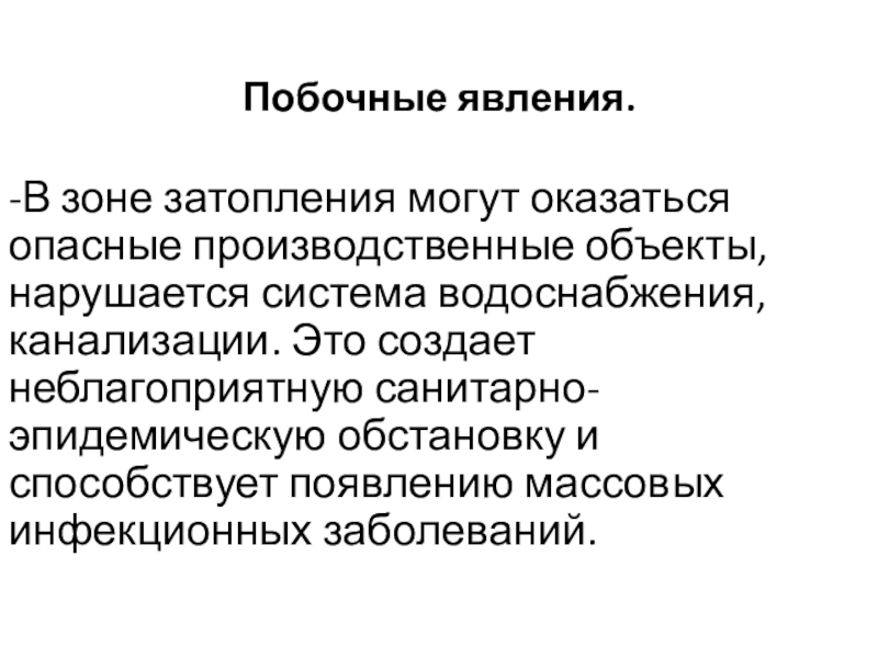 -Катастрофическое затопление территорий, городов, прекращение судоходства, рыбопромыслового производства.