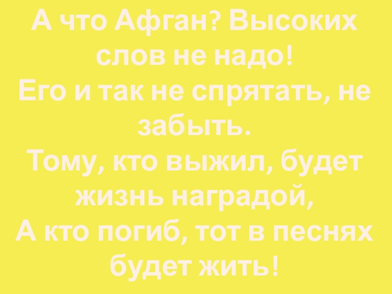 А что Афган? Высоких слов не надо!Его и так не спрятать, не забыть.Тому, кто выжил, будет жизнь наградой,А кто погиб, тот в песнях будет жить!