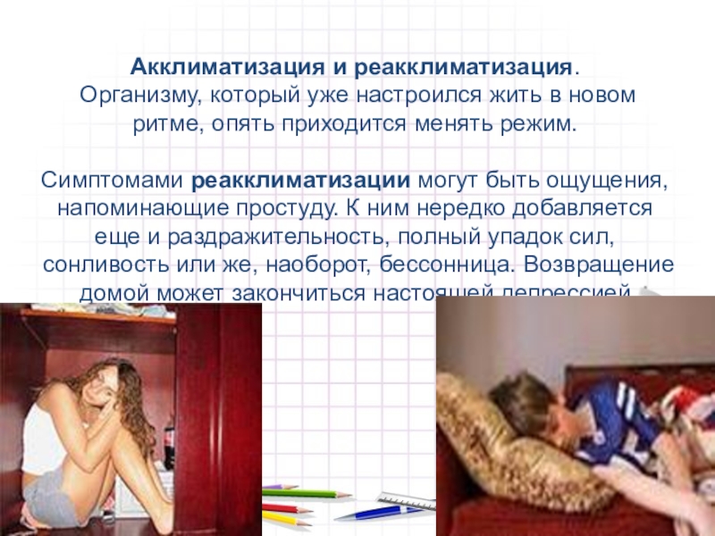 Слайд 7Акклиматизация и реакклиматизация. Организму, который уже настроился жить в новом ритме,