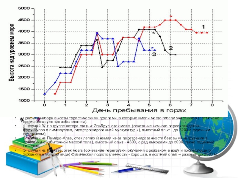 Графики набора высоты туристическими группами, в которых имели место гибели участников (* отмечено время обнаружения заболевания):1- случай