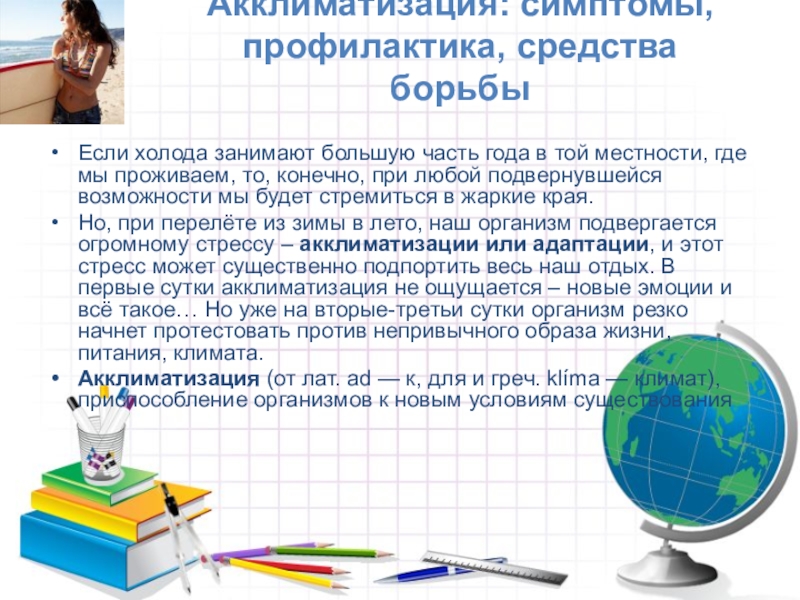Слайд 2Акклиматизация: симптомы, профилактика, средства борьбы