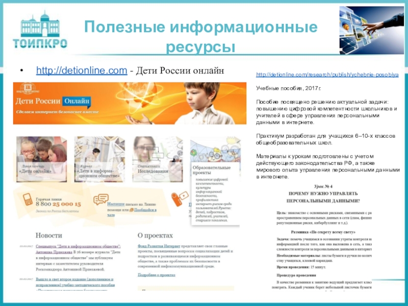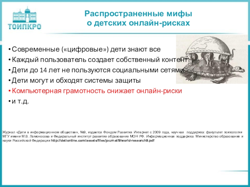 Журнал «Дети в информационном обществе», №9, издается Фондом Развития Интернет с 2009 года, научная поддержка: факультет психологии МГУ имени М.В. Ломоносова и Федеральный институт развития образования МОН РФ. Информационная поддержка: Министерство образования и науки Российской Федерации http://detionline.com/assets/files/journal/9/world-research9.pdf
