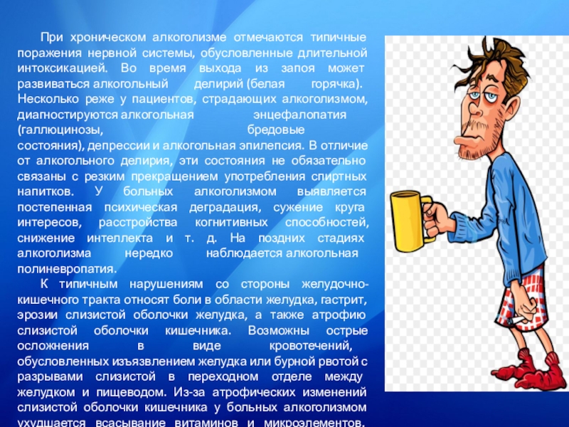 Слайд 17При хроническом алкоголизме отмечаются типичные поражения нервной системы, обусловленные длительной интоксикацией.