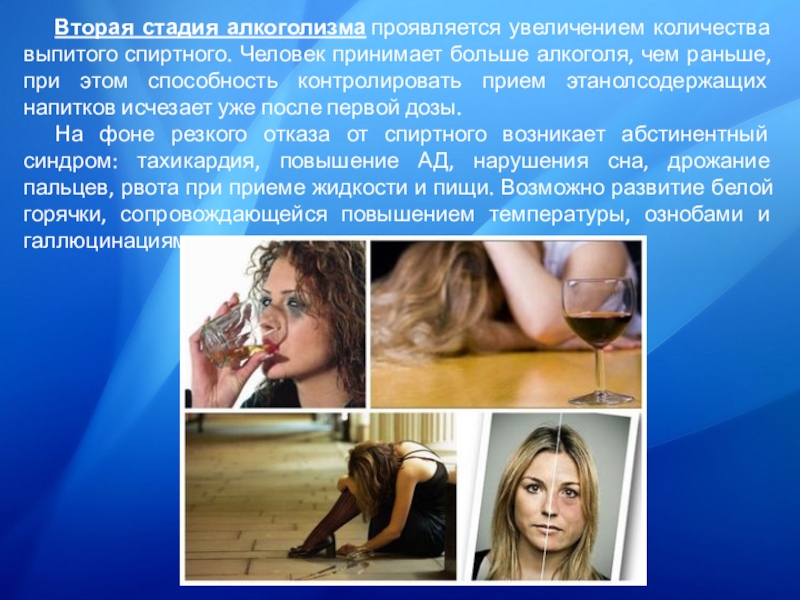 Слайд 22Вторая стадия алкоголизма проявляется увеличением количества выпитого спиртного. Человек принимает больше алкоголя,