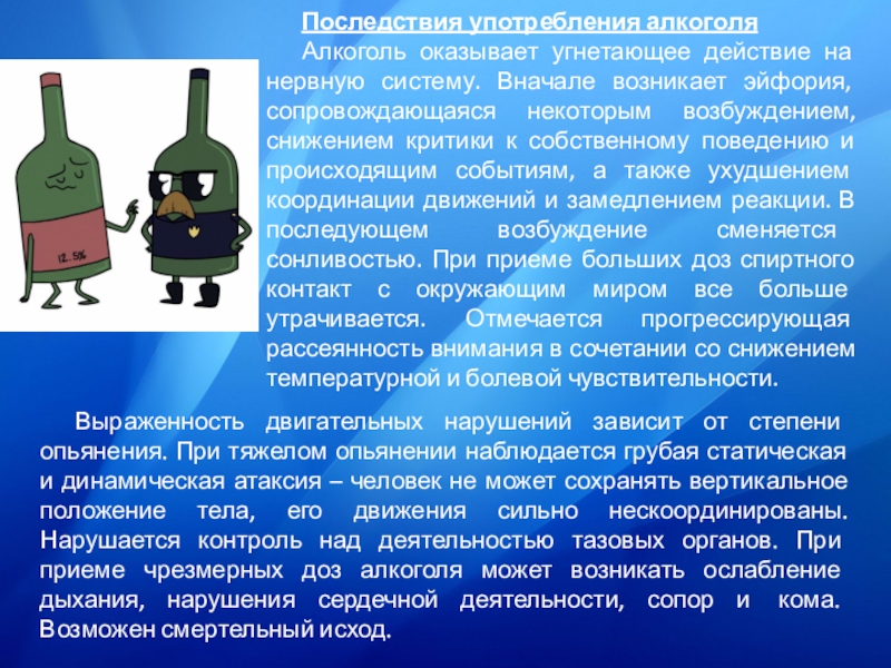 грубая статическая и динамическая атаксия – человек не может сохранять вертикальное положение тела, его движения сильно нескоординированы. Нарушается контроль над деятельностью тазовых органов. При приеме чрезмерных доз алкоголя может возникать ослабление дыхания, нарушения сердечной деятельности, сопор и кома. Возможен смертельный исход.