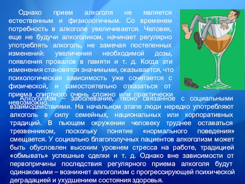 Слайд 15Однако прием алкоголя не является естественным и физиологичным. Со временем потребность