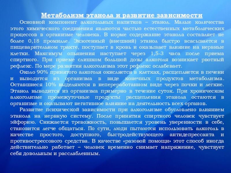 количества этого химического соединения являются частью естественных метаболических процессов в организме человека. В норме содержание этанола составляет не более 0,18 промилле. Экзогенный (внешний) этанол быстро всасывается в пищеварительном тракте, поступает в кровь и оказывает влияние на нервные клетки. Максимум опьянения наступает через 1,5-3 часа после приема спиртного. При приеме слишком большой дозы алкоголя возникает рвотный рефлекс. По мере развития алкоголизма этот рефлекс ослабевает.