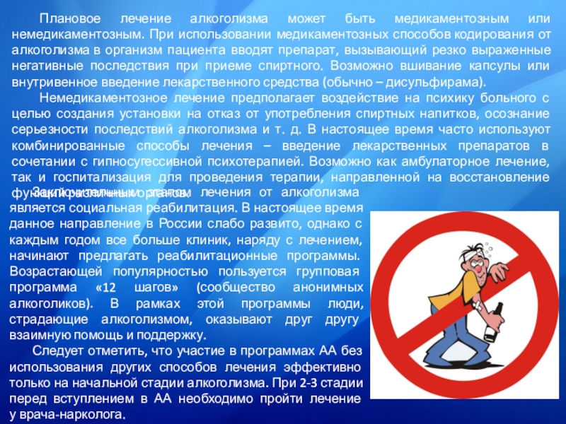 Слайд 25Плановое лечение алкоголизма может быть медикаментозным или немедикаментозным. При использовании медикаментозных