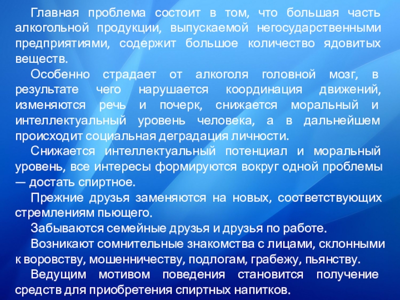 Снижается интеллектуальный потенциал и моральный уровень, все интересы формируются вокруг одной проблемы — достать спиртное.