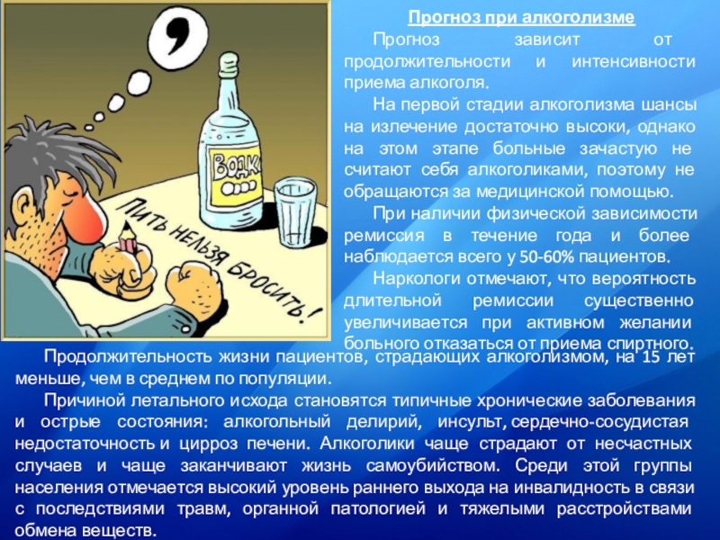 Продолжительность жизни пациентов, страдающих алкоголизмом, на 15 лет меньше, чем в среднем по популяции.