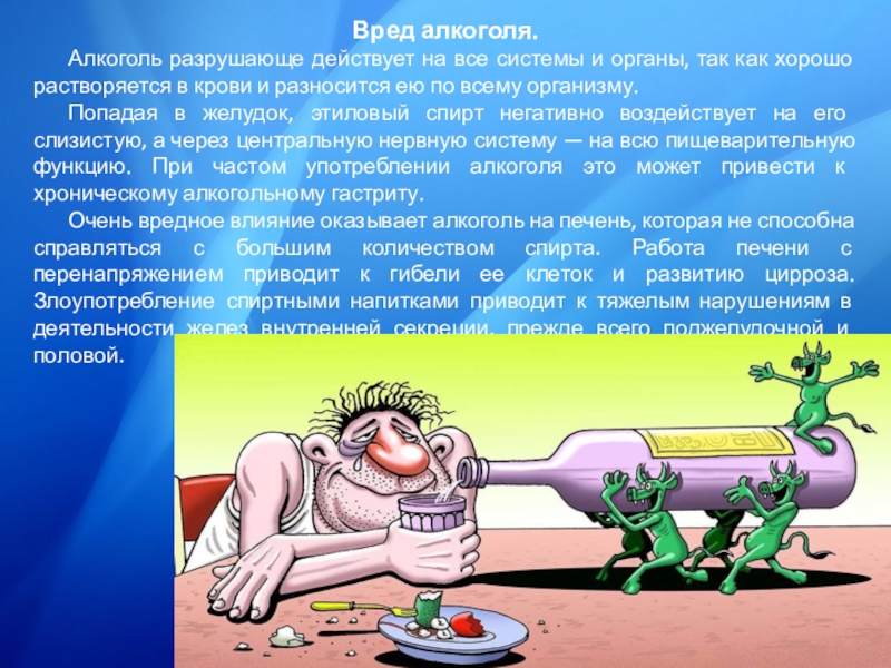 Очень вредное влияние оказывает алкоголь на печень, которая не способна справляться с большим количеством спирта. Работа печени с перенапряжением приводит к гибели ее клеток и развитию цирроза.