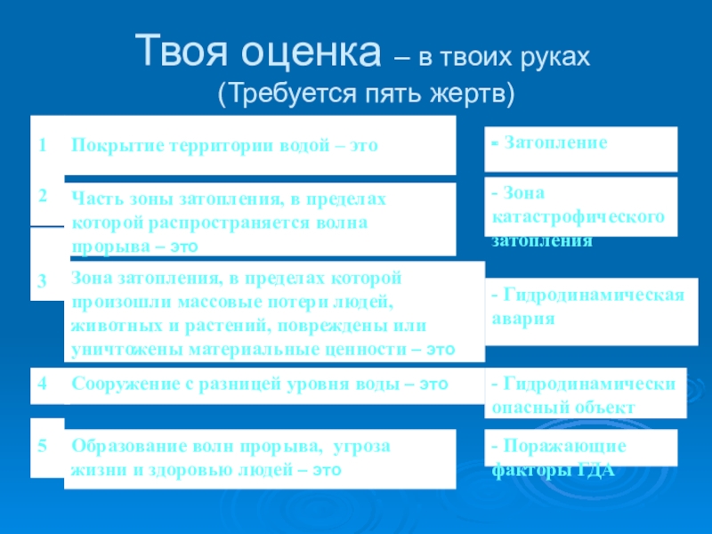 районе г. Волгограда. Неожиданно послышался настойчивый звук сирен и гудки. Включив радиоприемник, вы услышали сообщение управления ГОЧС о теракте на шлюзах Волго-Донского канала и возможном затоплении части района. Населению рекомендовано срочно покинуть дома и выйти в безопасные места.