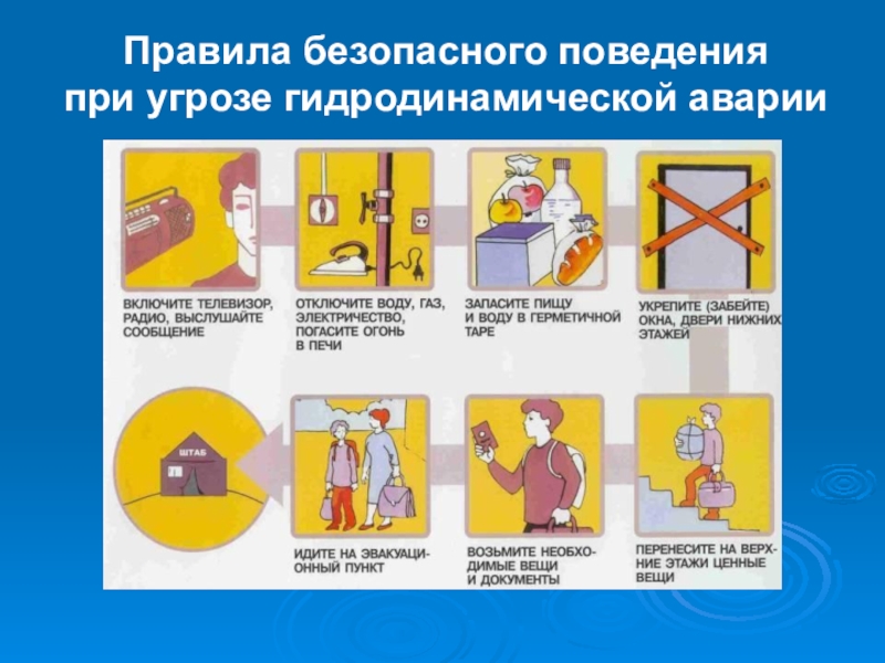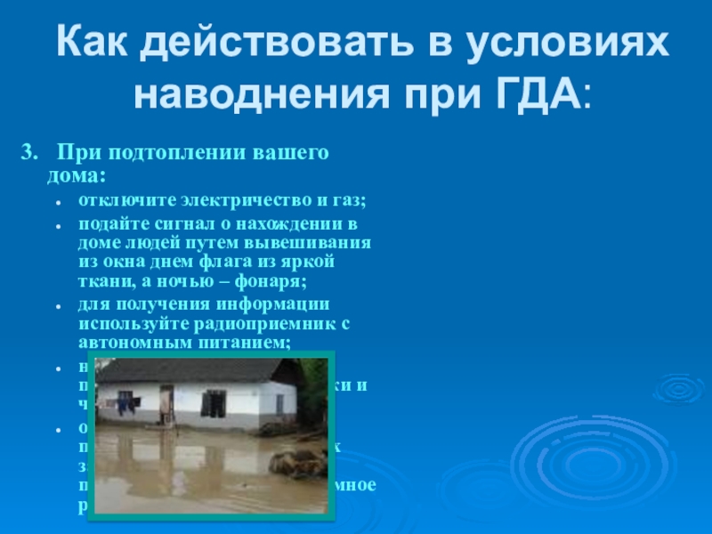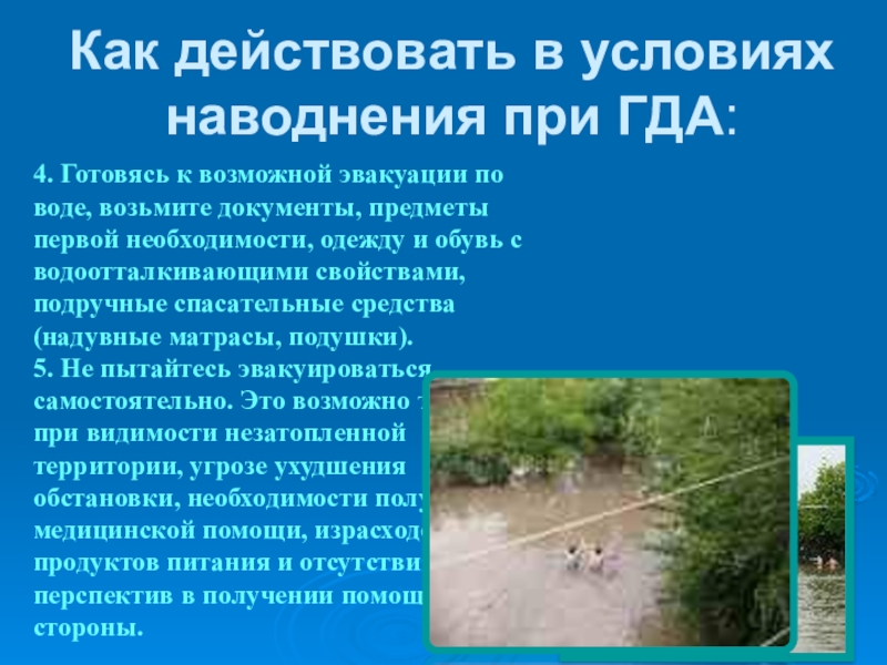 Слайд 27Как действовать в условиях наводнения при ГДА: