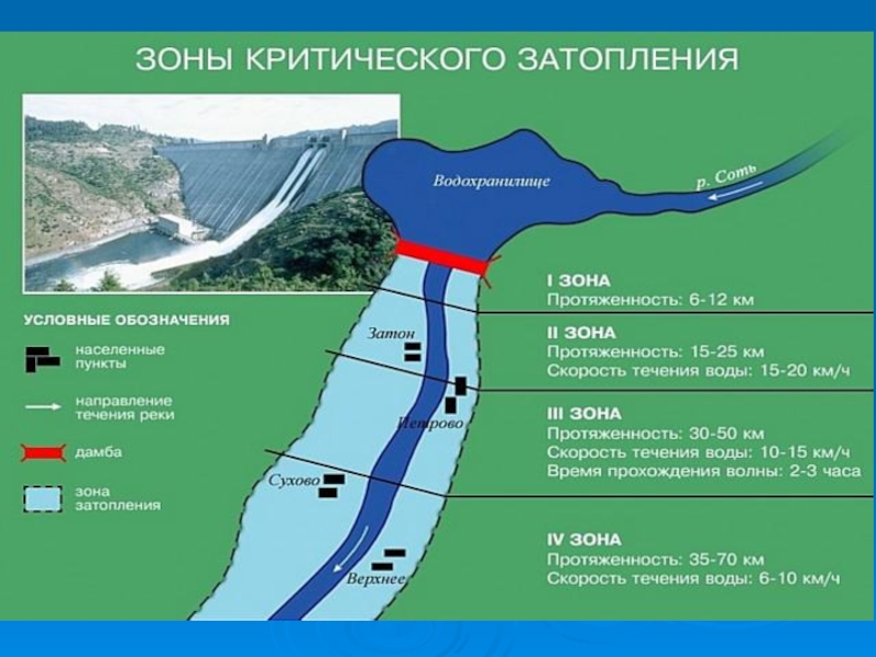 затопление больших территорий, населенных пунктов, смыв плодородного слоя
