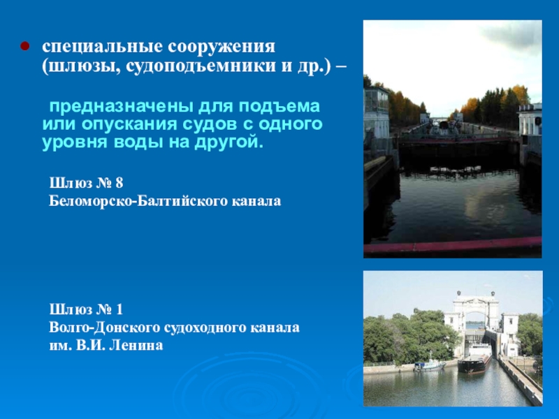 Слайд 9специальные сооружения (шлюзы, судоподъемники и др.) –