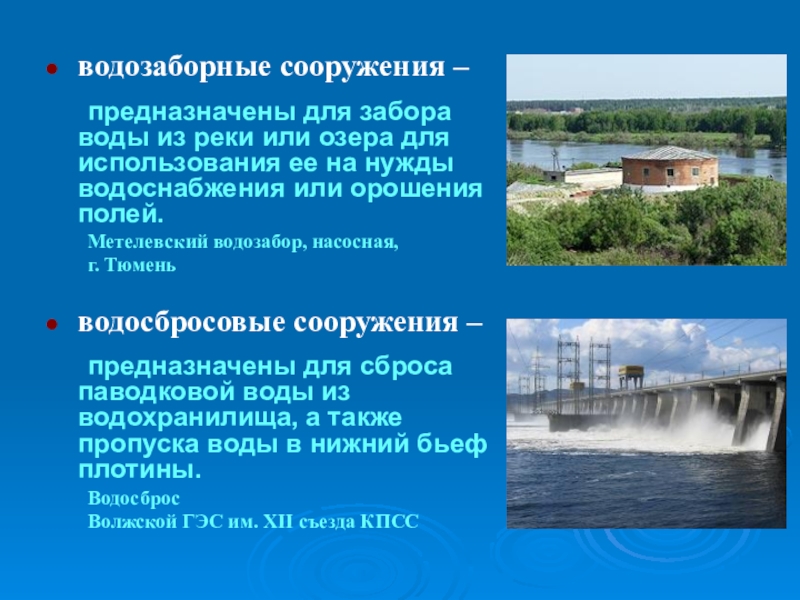 создающие разницу уровней воды до (верхний бьеф) и после него (нижний бьеф), аварии на которых могут привести к катастрофическим последствиям.