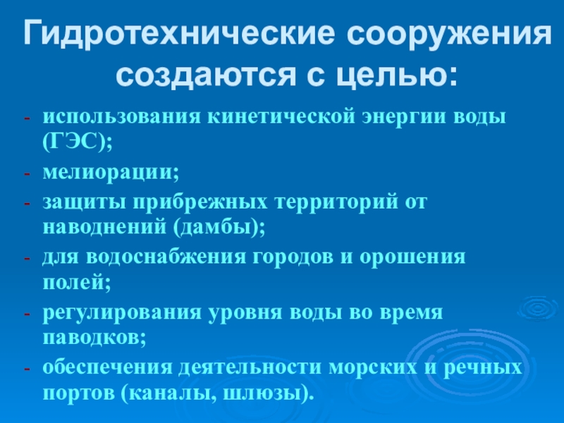 Слайд 6Гидротехнические сооружения создаются с целью: