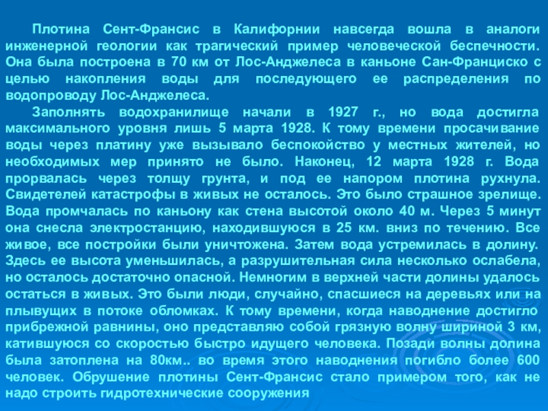 Слайд 52Плотина Сент-Франсис в Калифорнии навсегда вошла в аналоги инженерной геологии как