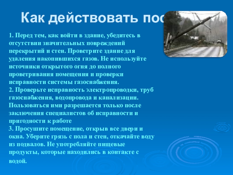 2. Проверьте исправность электропроводки, труб газоснабжения, водопровода и канализации. Пользоваться ими разрешается только после заключения специалистов об исправности и пригодности к работе