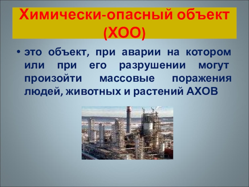 Химически-опасный объект (ХОО)это объект, при аварии на котором или при его разрушении могут произойти массовые поражения людей,