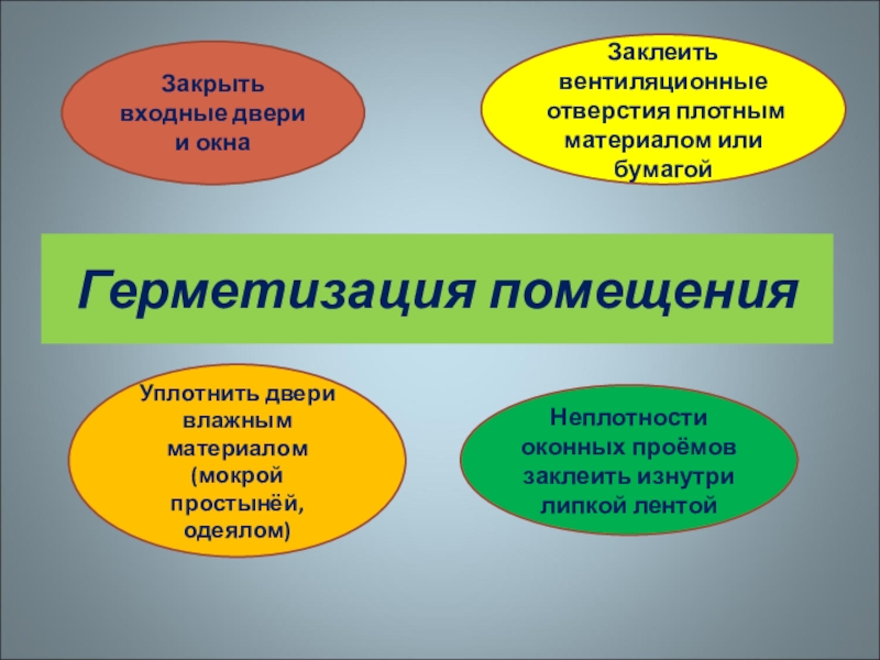 Герметизация помещенияЗакрыть входные двери и окна Заклеить вентиляционные отверстия плотным материалом или бумагойУплотнить двери влажным материалом (мокрой