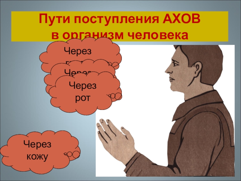 Пути поступления АХОВ  в организм человекаЧерез глазаЧерез носЧерез ротЧерез кожу