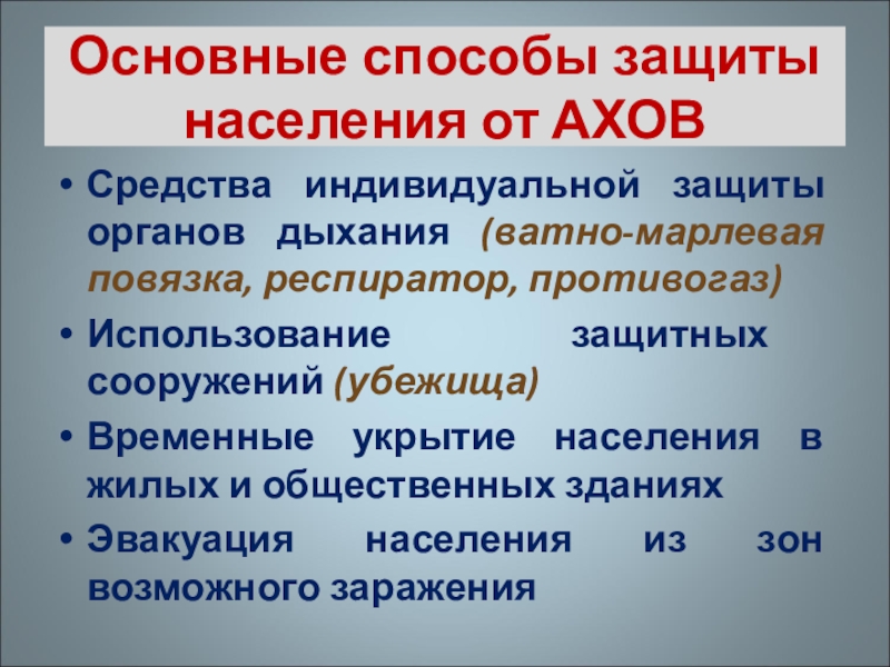 Основные способы защиты населения от АХОВСредства индивидуальной защиты органов дыхания (ватно-марлевая повязка, респиратор, противогаз)Использование защитных сооружений (убежища)Временные
