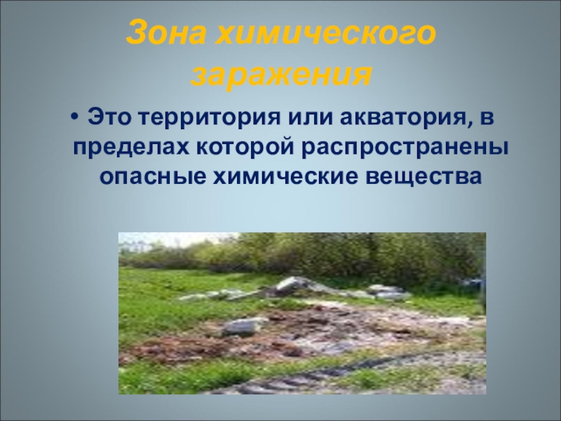Зона химического зараженияЭто территория или акватория, в пределах которой распространены опасные химические вещества