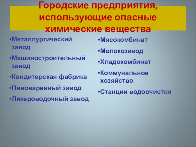 Городские предприятия, использующие опасные химические вещества Металлургический заводМашиностроительный заводКондитерская фабрикаПивоваренный заводЛикероводочный заводМясокомбинатМолокозаводХладокомбинатКоммунальное хозяйствоСтанции водоочистки