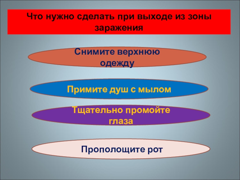Что нужно сделать при выходе из зоны зараженияСнимите верхнюю одеждуПримите душ с мыломТщательно промойте глаза Прополощите рот