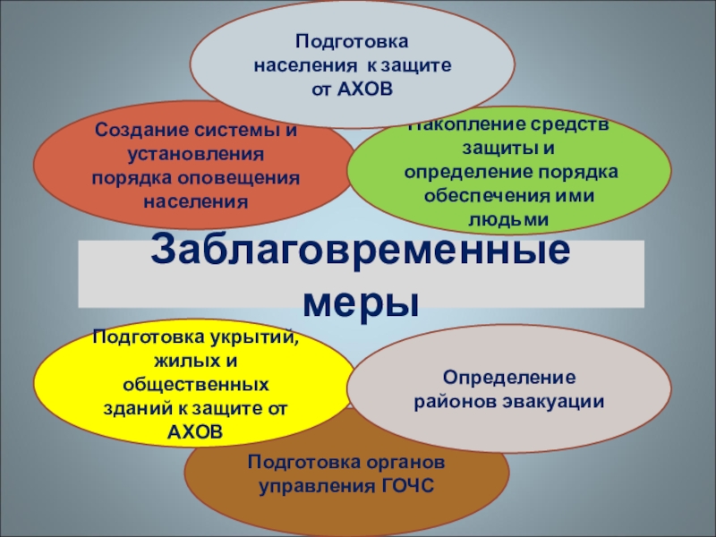 Заблаговременные мерыСоздание системы и установления порядка оповещения населенияПодготовка органов управления ГОЧСПодготовка укрытий, жилых и общественных зданий к