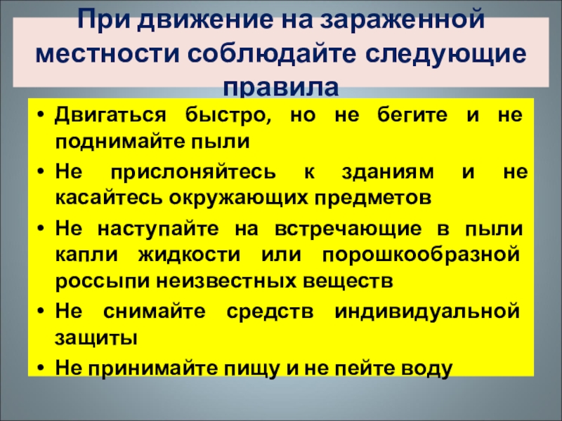 При движение на зараженной местности соблюдайте следующие правилаДвигаться быстро, но не бегите и не поднимайте пылиНе прислоняйтесь