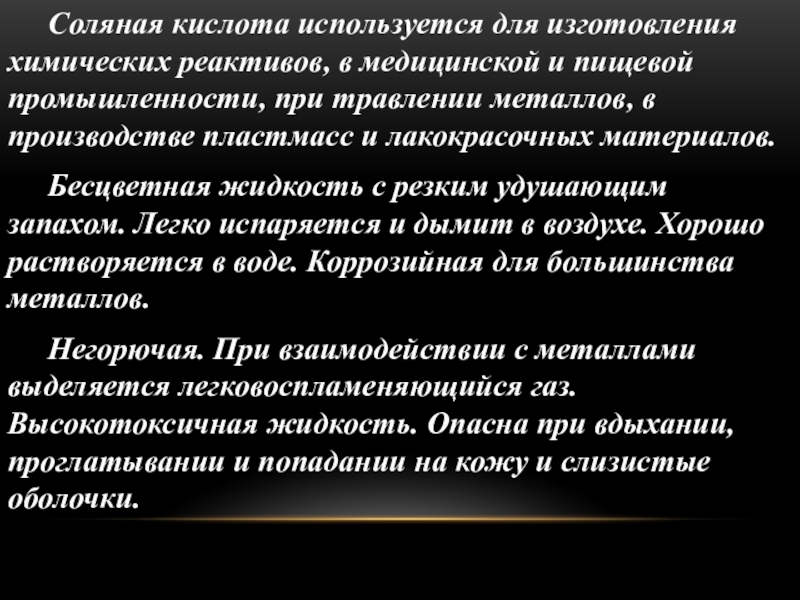 Соляная кислота используется для изготовления химических реактивов, в медицинской и пищевой