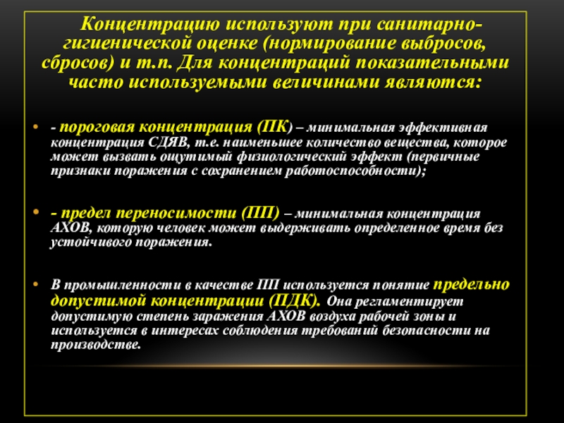Концентрацию используют при санитарно-гигиенической оценке (нормирование выбросов, сбросов) и