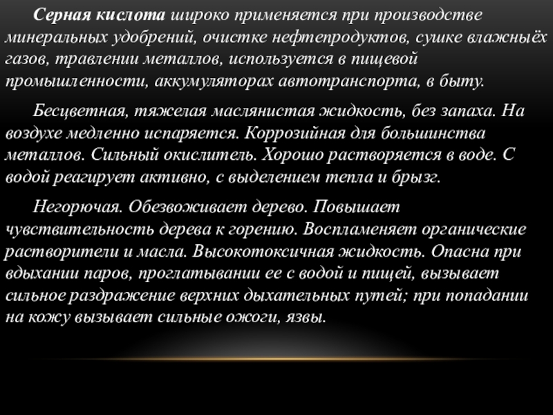 Серная кислота широко применяется при производстве минеральных удобрений, очистке нефтепродуктов, сушке