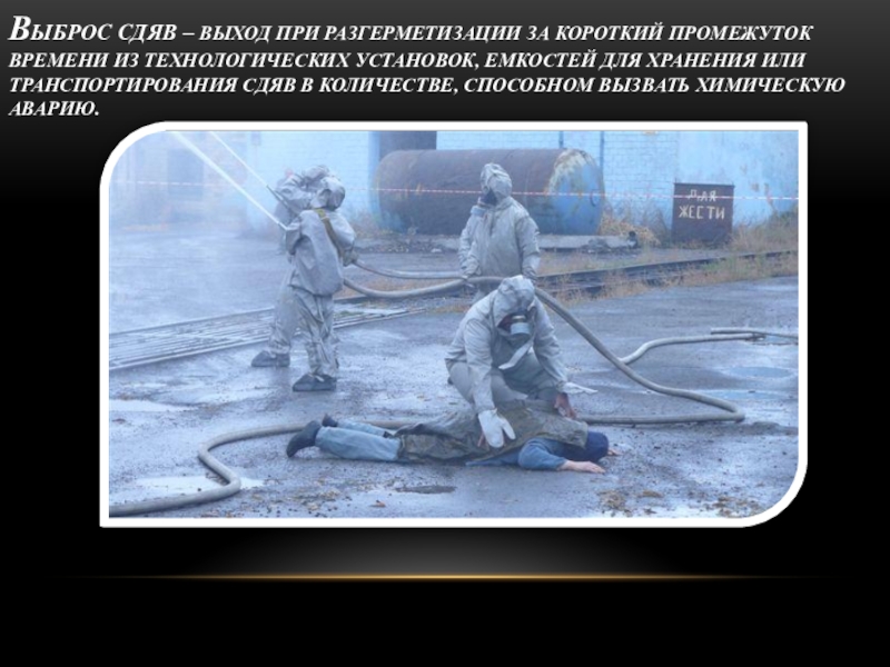 Слайд 17Выброс СДЯВ – выход при разгерметизации за короткий промежуток времени из