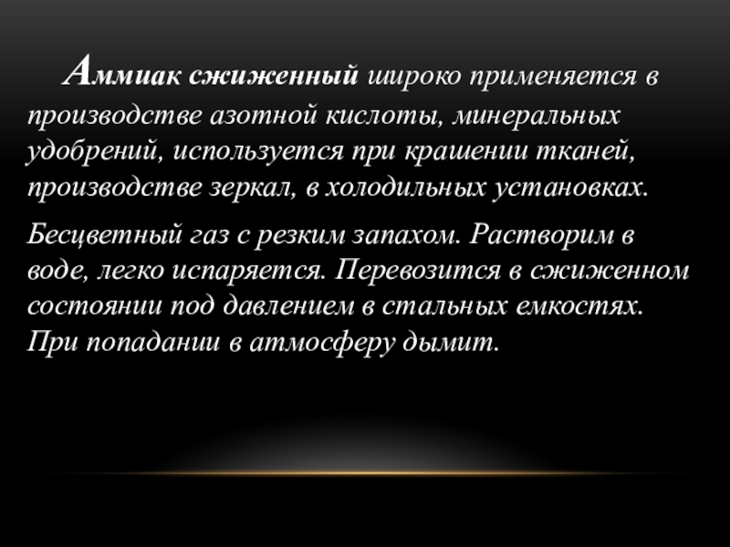 Аммиак сжиженный широко применяется в производстве азотной кислоты, минеральных удобрений, используется