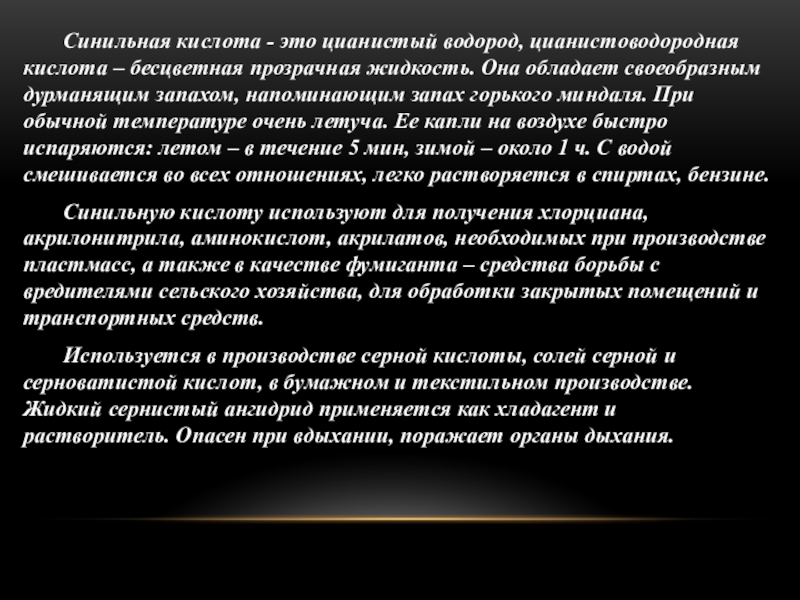 Синильную кислоту используют для получения хлорциана, акрилонитрила, аминокислот, акрилатов, необходимых при производстве пластмасс, а также в качестве фумиганта – средства борьбы с вредителями сельского хозяйства, для обработки закрытых помещений и транспортных средств.