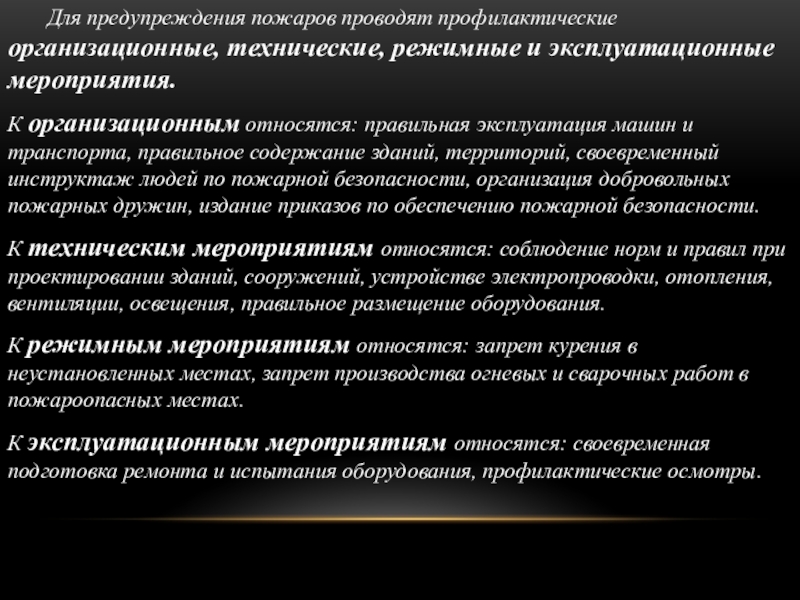 Для предупреждения пожаров проводят профилактические организационные, технические, режимные и эксплуатационные мероприятия.