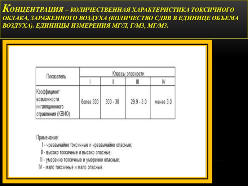 Слайд 13Концентрация – количественная характеристика токсичного облака, зараженного воздуха (количество СДЯВ в