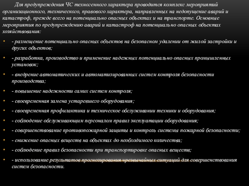 характера, направленных на недопущение аварий и катастроф, прежде всего на потенциально опасных объектах и на транспорте. Основные мероприятия по предупреждению аварий и катастроф на потенциально опасных объектах хозяйствования: