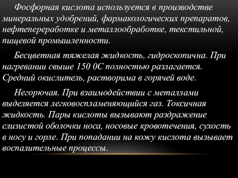 Фосфорная кислота используется в производстве минеральных удобрений, фармакологических препаратов, нефтепереработке и