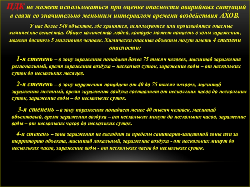У нас более 540 объектов, где хранятся, используются или производятся опасные химические вещества. Общее количество людей, которое может попасть в зоны заражения, может достичь 5 миллионов человек. Химически опасные объекты могут иметь 4 степени опасности: