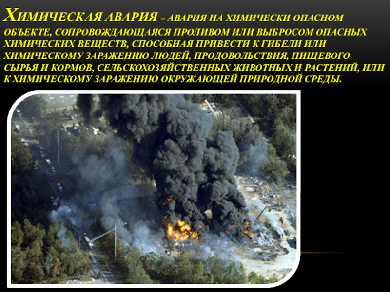 Слайд 7Химическая авария – авария на химически опасном объекте, сопровождающаяся проливом или