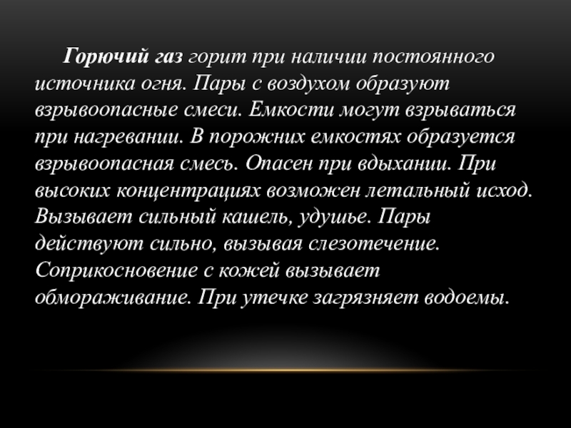образуют взрывоопасные смеси. Емкости могут взрываться при нагревании. В порожних емкостях образуется взрывоопасная смесь. Опасен при вдыхании. При высоких концентрациях возможен летальный исход. Вызывает сильный кашель, удушье. Пары действуют сильно, вызывая слезотечение. Соприкосновение с кожей вызывает обмораживание. При утечке загрязняет водоемы.