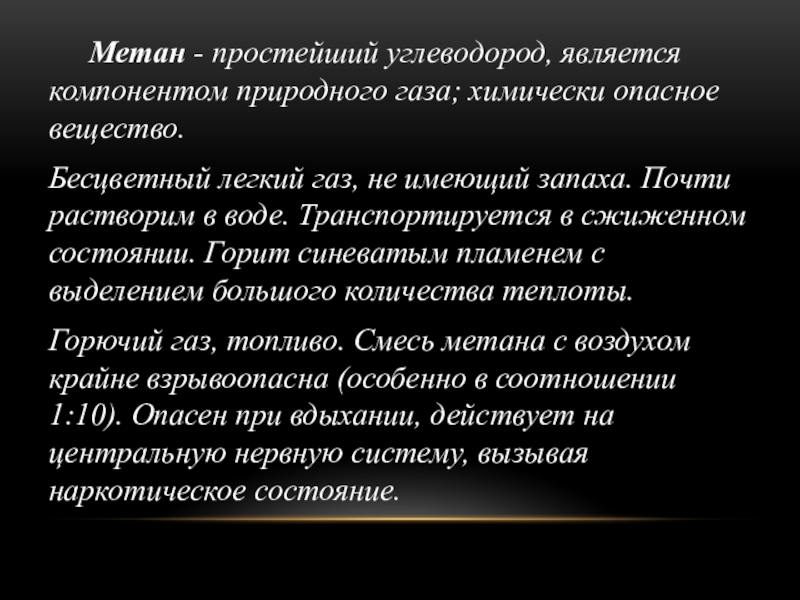 Метан - простейший углеводород, является компонентом природного газа; химически опасное вещество.