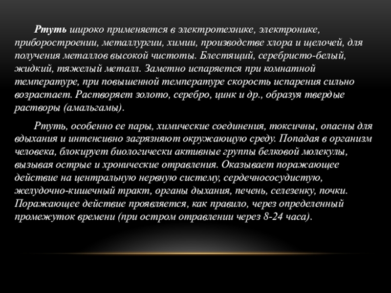 и щелочей, для получения металлов высокой чистоты. Блестящий, серебристо-белый, жидкий, тяжелый металл. Заметно испаряется при комнатной температуре, при повышенной температуре скорость испарения сильно возрастает. Растворяет золото, серебро, цинк и др., образуя твердые растворы (амальгамы).