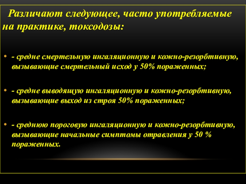 Различают следующее, часто употребляемые на практике, токсодозы: