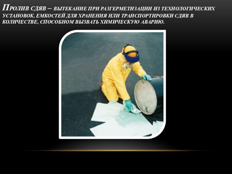 Слайд 18Пролив СДЯВ – вытекание при разгерметизации из технологических установок, емкостей для