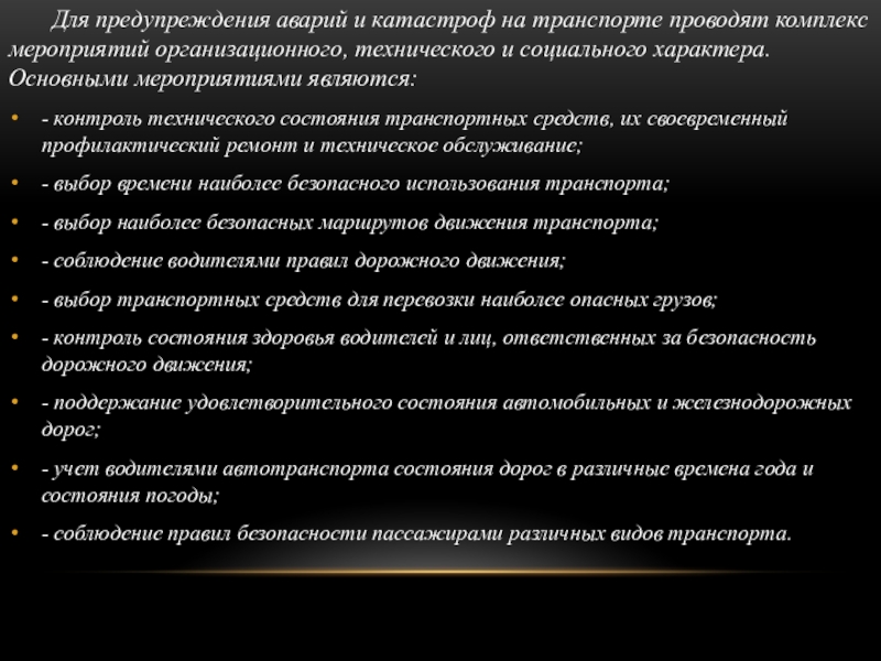 Для предупреждения аварий и катастроф на транспорте проводят комплекс мероприятий организационного,